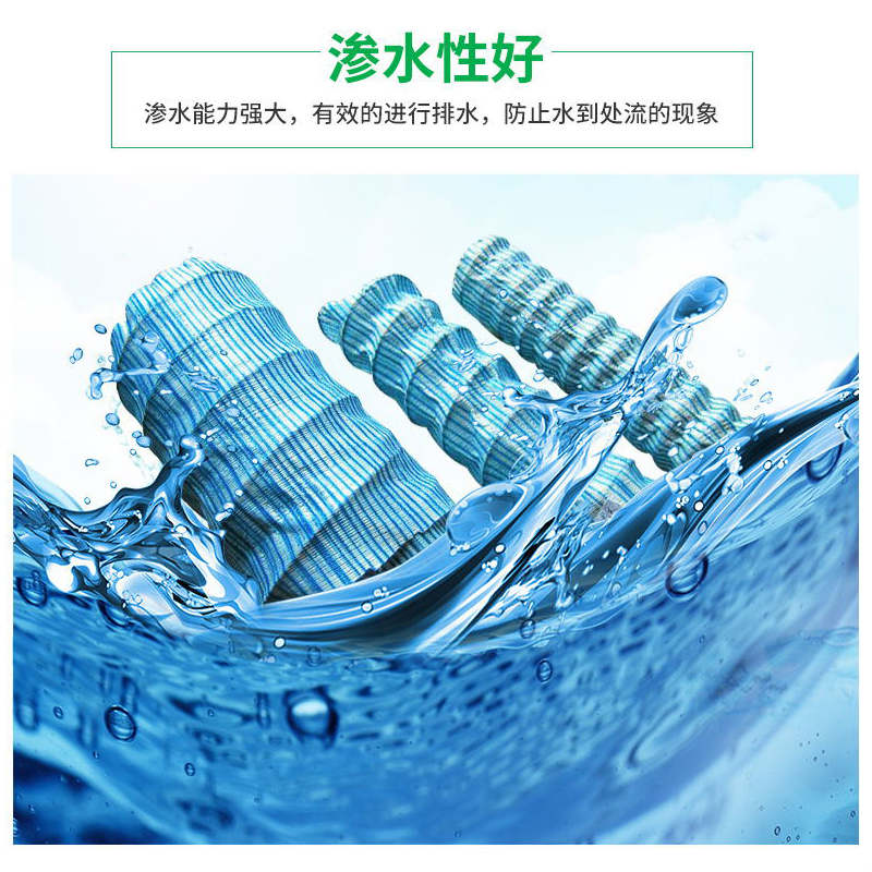 透水管是以防銹彈簧圈支撐管體,形成高抗壓軟式結構,無紡布內襯過濾,使泥砂雜質不能進入管內,從而達到凈滲水的功能。滌綸絲外繞祉覆層具有優(yōu)良吸水性,能迅速收集土體中多余水份。橡膠筋使管壁被覆層與彈簧鋼圈管體成為有機一體,具有很好的全方位透水功能,滲透水順利滲入管內,而泥砂雜質被阻擋在管外,從而達到透水、過濾、排水之目的。
